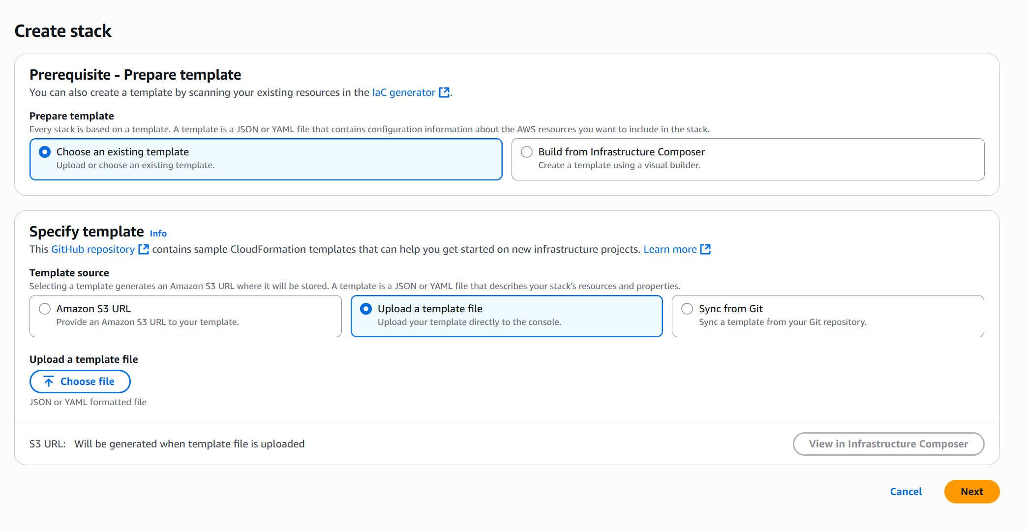 - Click Choose an Existing Template, Upload a template file and then upload the main.yaml file you find here: GitHub – New-Math-Data/Bootstrap: Creates an identity provider in a customer account.
