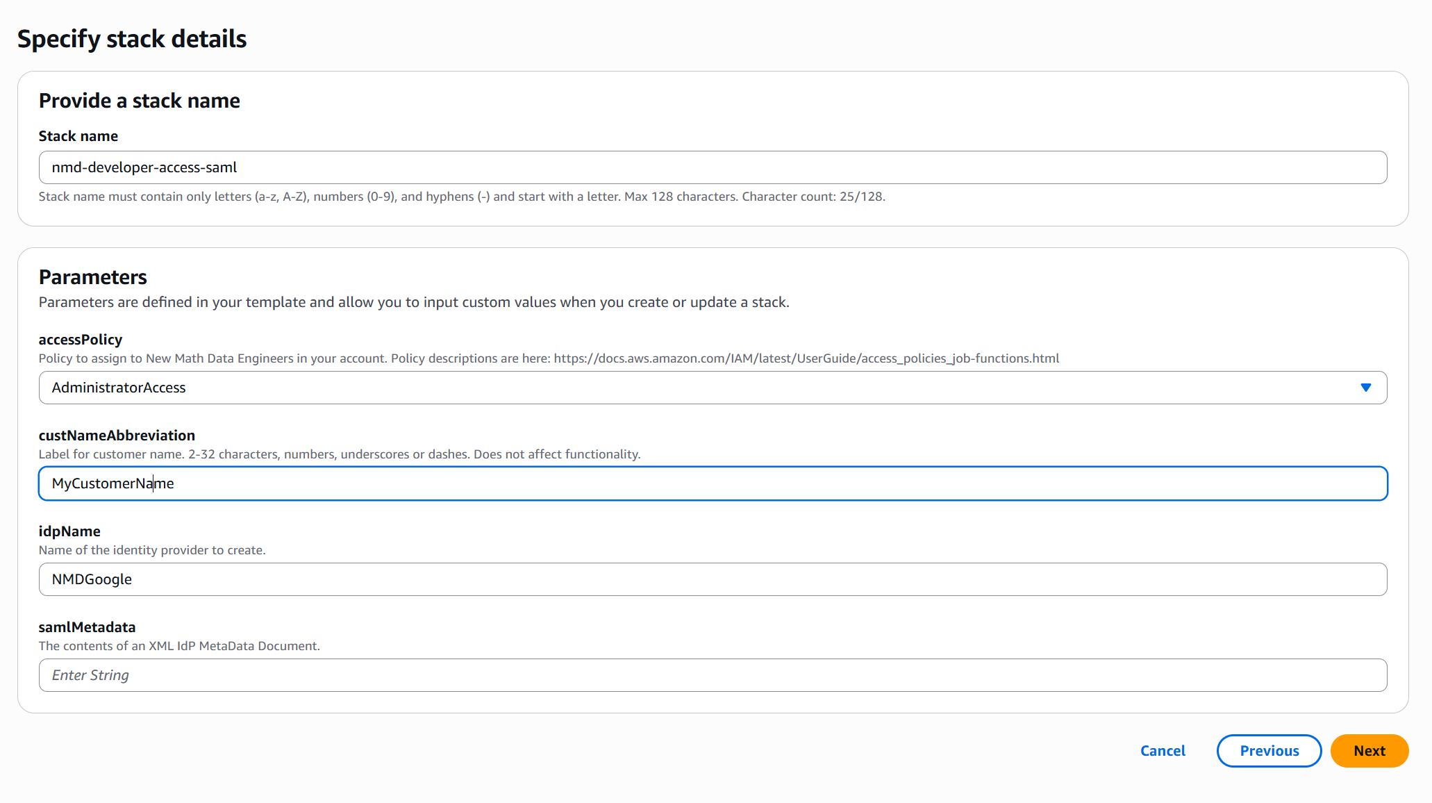 - Click Next and type nmd-developer-access-saml in the Stack Name box.